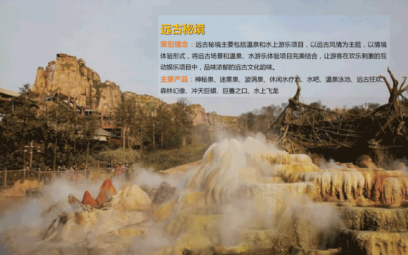 度假溫泉度假區入口大門/遠古大道/遠古廣場/遠古主題景觀圍繞地心文化主題,提取巨型動物化石、枯樹木、獸骨、蛛網、石堆、龍蛋及主題故事線中IP形象等元素進行主題包裝,營造遠古時期原始、神秘、荒蕪的主題場景,激發游客的好奇心,快速進入設定的的主題故事中。