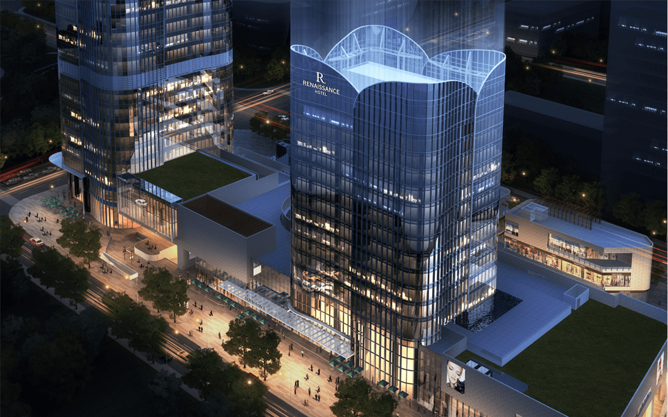 萬麗酒店總建筑面積:200653.85㎡,其中地上建筑面積122504.63㎡,包括1棟43層(79619.86㎡)的超高層國際5A甲級寫字樓(T1塔樓);1棟18層(33500㎡)的國際知名品牌酒店(T2塔樓);1棟獨棟及商業(yè)裙樓(7120.98㎡);五層地下室總建筑面積78149.22㎡,包含5000㎡的商業(yè)地下室,1216個機動停車位及設(shè)備用房。